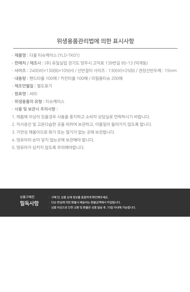 - 제품 특성상 단순 변심, 부주의에 의한 제품 손상 및 파손, 사용 및 개봉한 경우 교환/반품이 불가합니다.